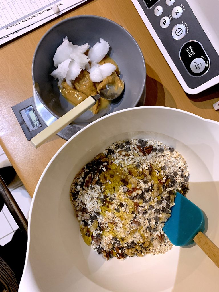 1- Faire fondre l’huile de coco, le beurre de cachuète et le miel (ou sirop) ensemble dans un bol (perso je le met 30 secondes au micro ondes).