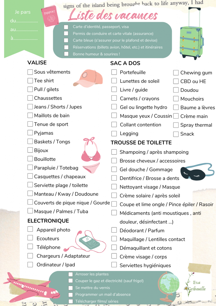 Je vous partage ci dessous ma To do list personnelle ! J’aime bien l’imprimer quelques jours avant les vacances et la mettre sur mon frigo ou ma porte ça me dit que c’est pour bientoooooooooooooooooooooooooooooooot!!!