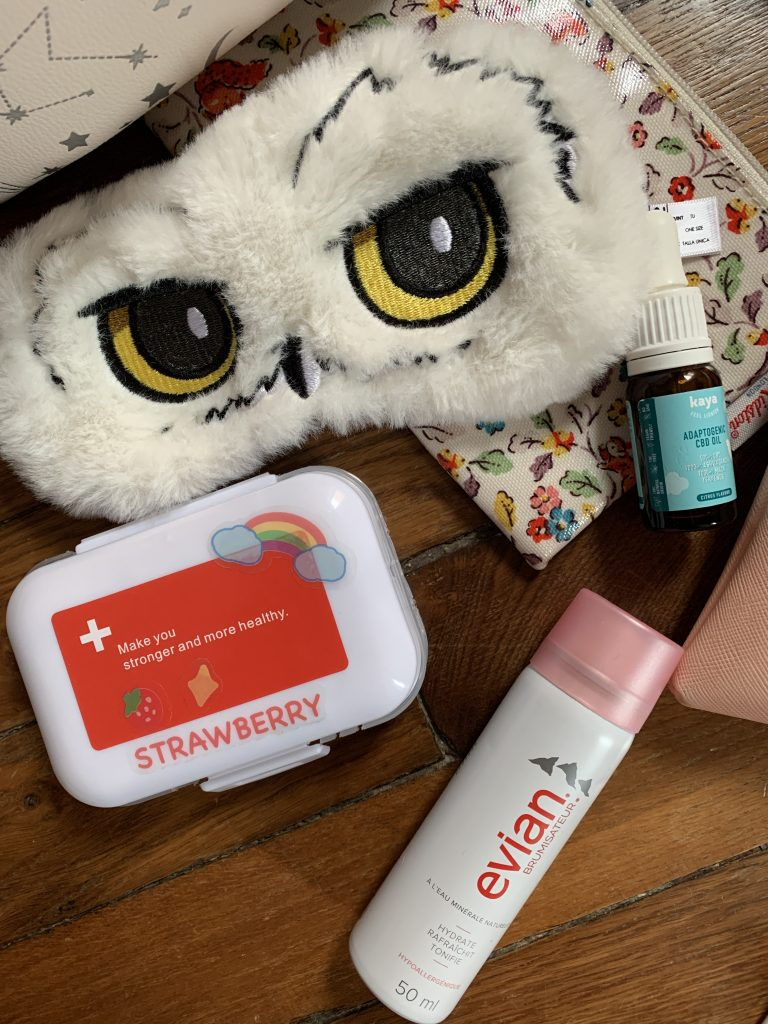 - Un petit truc détente (CBD, huile essentielles) : Si certains préfèrent une petite coupe de champagne pour se détendre, je n’aime pas spécialement boire en avion ! Pour me détendre si besoin, j’opte pour un spray de fleurs de bach, ou un roll on d’huiles essentielles a la lavande, ou encore un petit gummie de CBD.